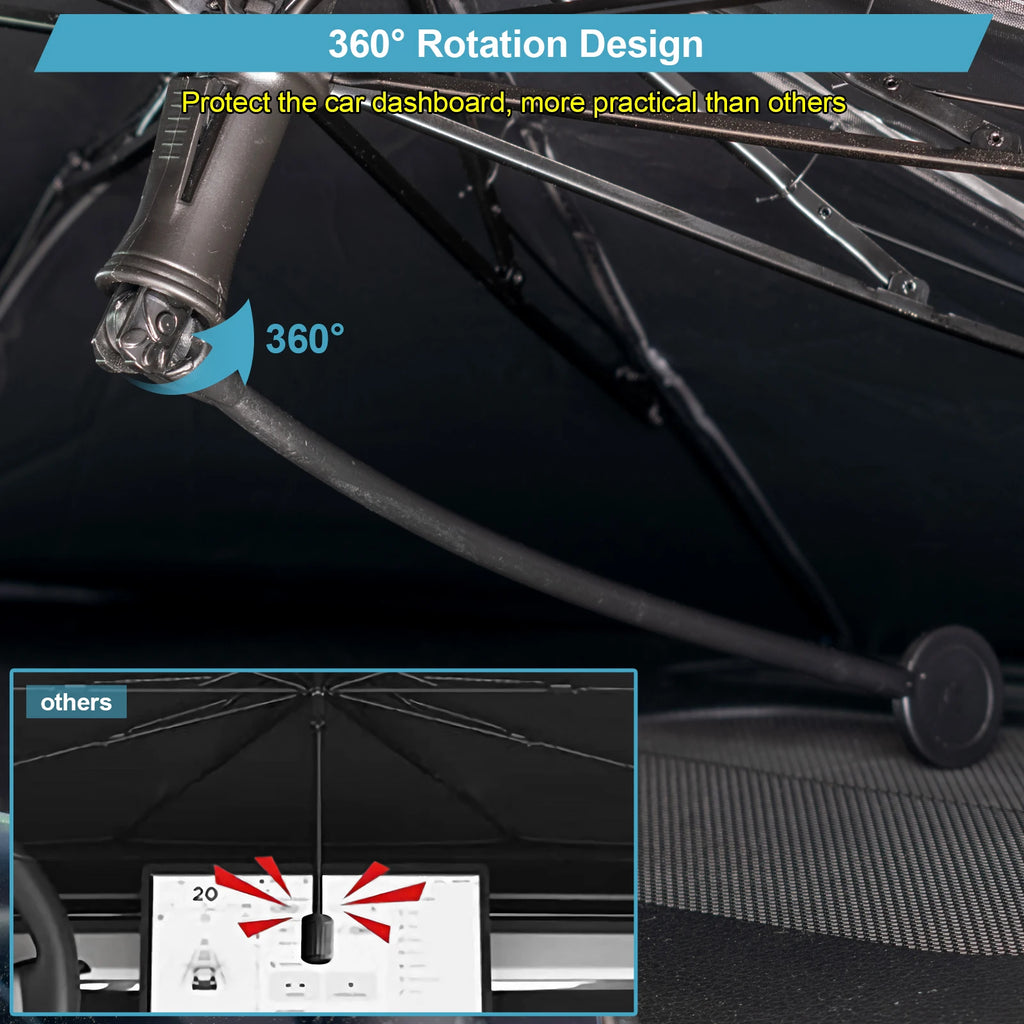 3. Certain Upgraded Designs For The Umbrella - First, a slot is designed on the upper side of the umbrella. With this slot, it can perfectly fit for the windshields or windscreens with rear view mirrors. Second, the unique idea - 360 degrees rotatable and bendable umbrella knob - is taken. The umbrella knobs of most of car sun umbrellas can't be rotated at 360 degrees and bendable. However, the umbrella knob of our car sun umbrella is made from soft plastic and can be 360 degrees rotatable and bendable, which better protect your car center console and dashboard from being scratched.