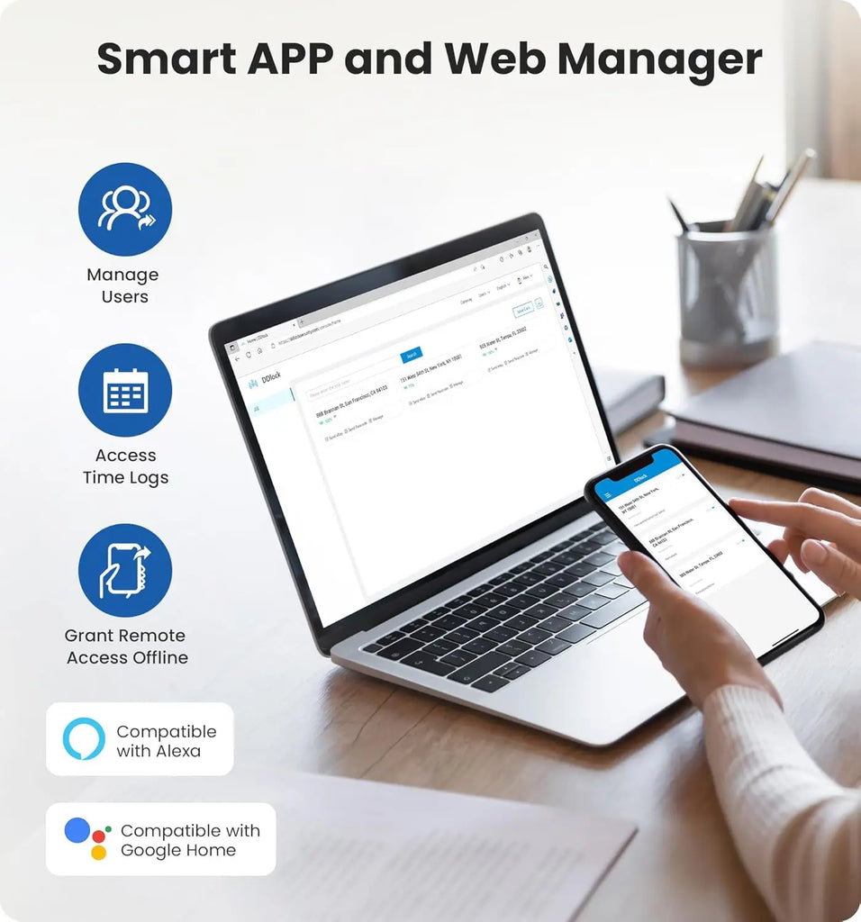 Manage access from anywhere. Remotely authorize users, track entry logs, and generate permanent, scheduled, one‑time, or recurring codes—ideal for landlords, rentals, and guest access.