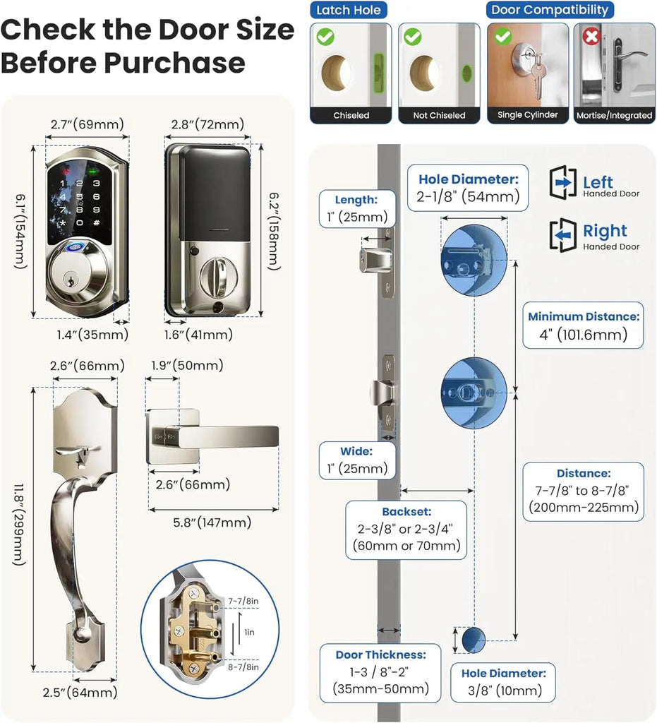 Auto‑detects door handing for quick installation—just a screwdriver needed. Backed by a 1‑year warranty, lifetime technical support, weekday phone hours (9 AM‑5 PM PST), and 24/7 email service.
