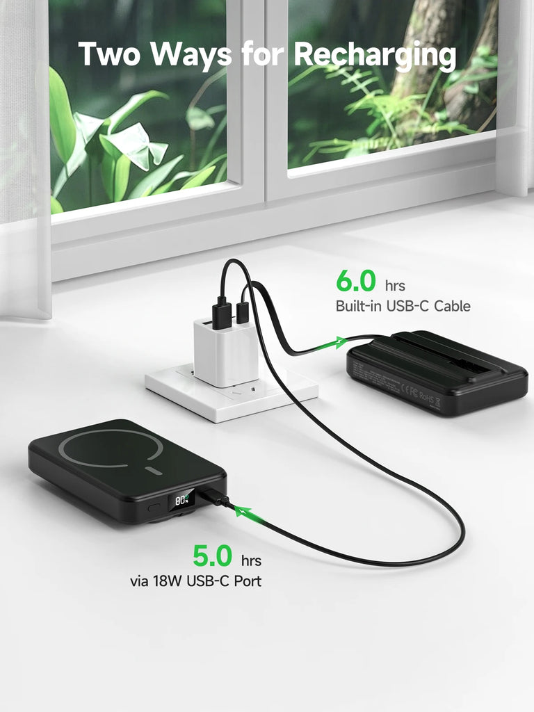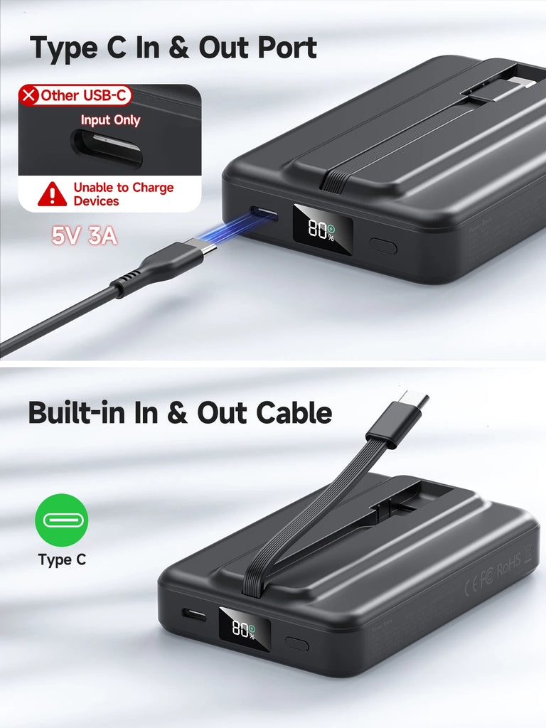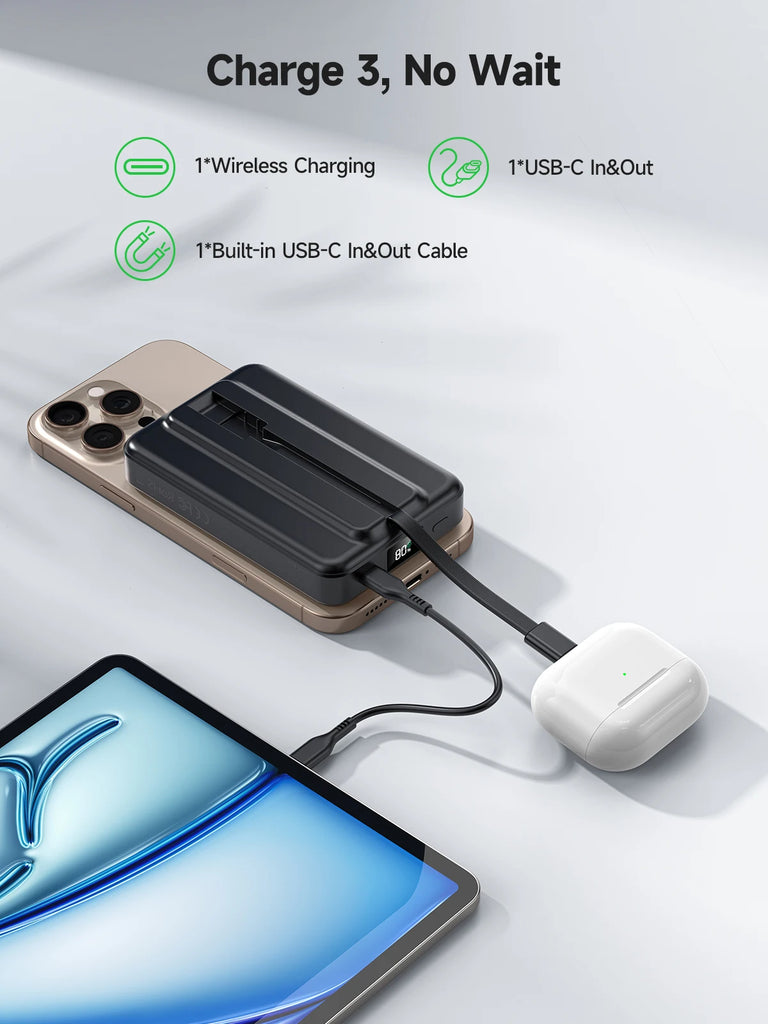 • 【Built-in USB-C Cable】The Built-in USB-C cable is compatible with iPhones, Samsung, Android phones, and tablets etc smart devices, directly charging anytime and anywhere. Additionally, you could also recharge the magnetic portable charger via this USB-C cable, eliminating the need to carry any extra cords when you're on the go